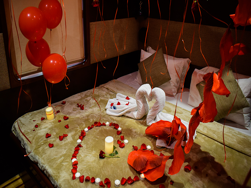 Our romantic packages are the perfect treat for that special someone in your life with everything you need for a romantic break away. And when it comes to romance, our wonderful house boat are the perfect backdrop. Main course table d’hote dinner for two adults with salad and sweets- Small cake- -15 balloons red color- -Rose flower red color- -Design the bedroom-