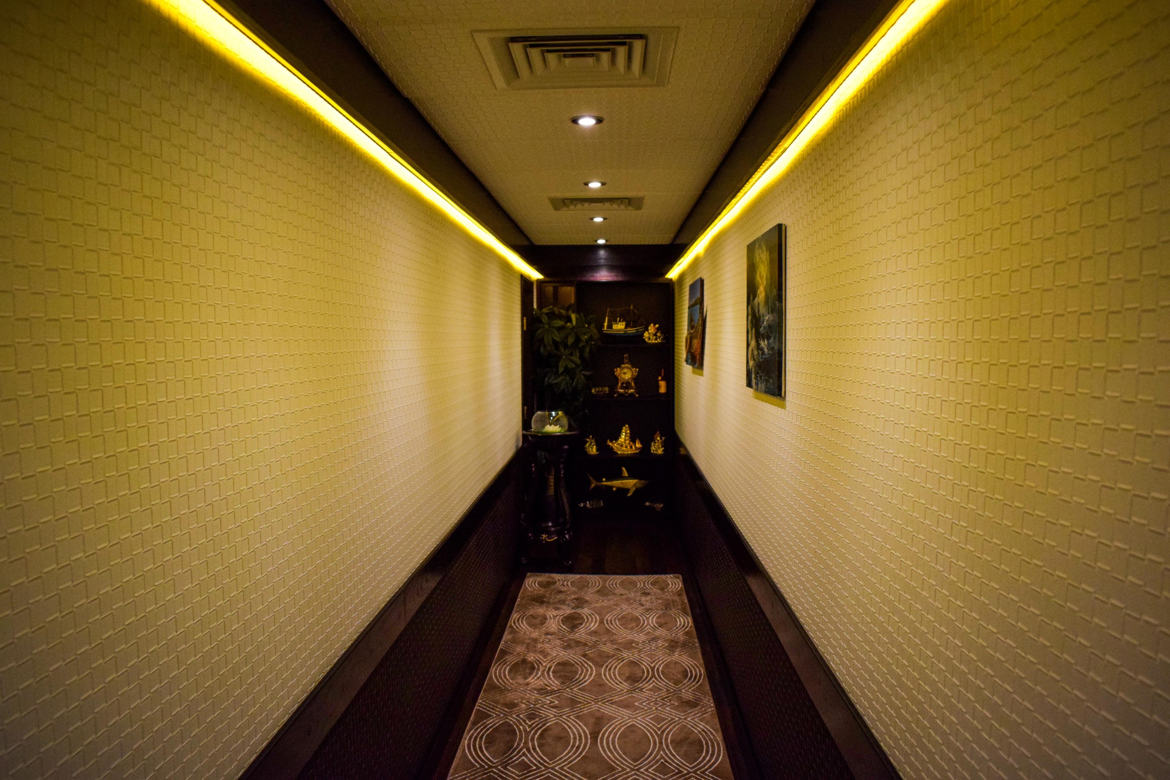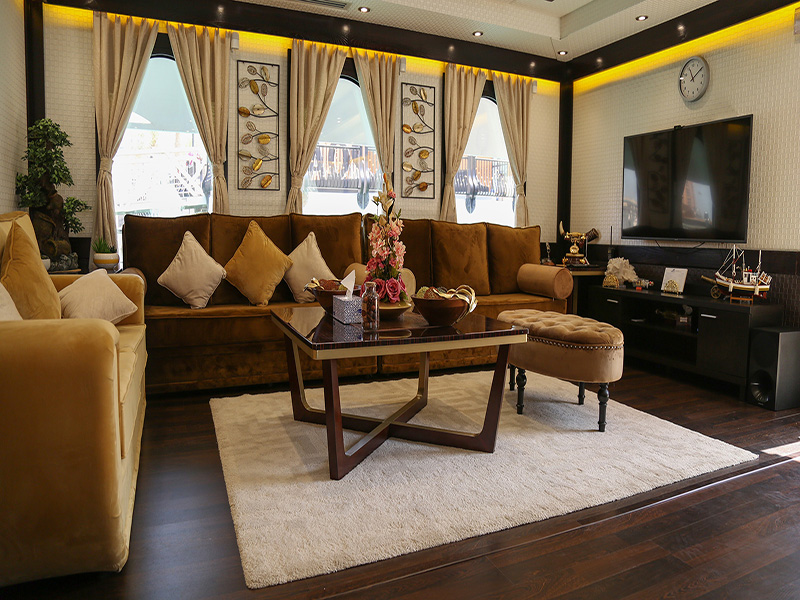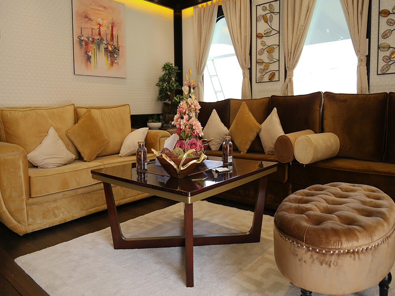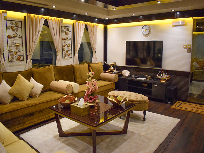 The Hall opulent arabic-themed interiors addition to a comfortable sofa, in addition to TV set and private terrace